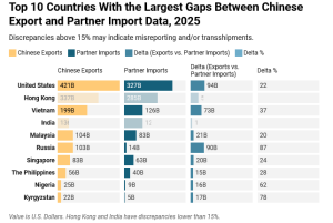 Οι δέκα χώρες με τις μεγαλύτερες αποκλίσεις μεταξύ των στοιχείων των κινεζικών εξαγωγών και των στοιχείων των εισαγωγών των εμπορικών εταίρων, το 2025. Αποκλίσεις άνω του 15% ενδέχεται να υποδηλώνουν εσφαλμένη καταγραφή και/ή μεταφόρτωση μέσω τρίτων χωρών. Η αξία εκφράζεται σε δολάρια ΗΠΑ. Το Χονγκ Κονγκ και η Ινδία εμφανίζουν αποκλίσεις μικρότερες του 15%. (Διάγραμμα: The Epoch Times. Πηγή: Global Trade Tracker. Δημιουργήθηκε με το Datawrapper)