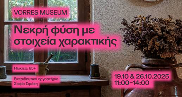 Η εικόνα της νεκρής φύσης αποτελεί μια μακρά εικαστική παράδοση, όπου αντικείμενα καθημερινής χρήσης συνδυάζονται με καρπούς, φυτά ή λουλούδια, δημιουργώντας συνθέσεις που αποτυπώνουν τη σχέση ανάμεσα σε όσα μένουν και όσα χάνονται. Στο εργαστήριο αυτό, οι συμμετέχοντες θα αντλήσουν έμπνευση από τη λαογραφική συλλογή του Πυργιού: ξύλινα εργαλεία και σκεύη του ποιμένα, εργαλεία της υφαντικής, μαρμάρινα υπέρθυρα, εκκλησιαστικά ξυλόγλυπτα, κοφίνια, σκάφες και ορειχάλκινες καμπάνες.