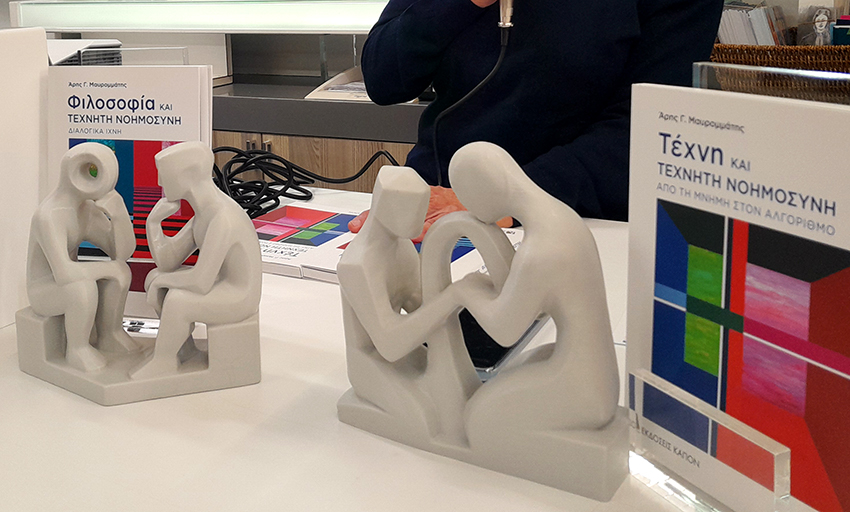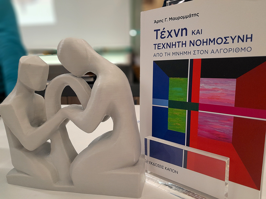 Μέρος της παρουσίασης αποτελούσαν ένα διάγραμμα του ανθρώπινου εγκεφάλου, και δύο μικρά γλυπτά του ιδίου, 3D εκτυπώσεις, που αναπαριστούσαν τη σχέση του ανθρώπου με την ΤΝ, το ένα σε σχέση με τη νόηση, το άλλο σε σχέση με την πράξη της δημιουργίας. Με τη βοήθειά τους, ο συγγραφέας προσπάθησε να μεταφέρει στο ακροατήριο πώς συνδέονται οι δύο λειτουργίες εντός μας, πώς επηρεάζει η μία την άλλη και πώς αυτό διαμορφώνει τη σχέση μας σε κάθε επίπεδο με την τεχνητή νοημοσύνη.