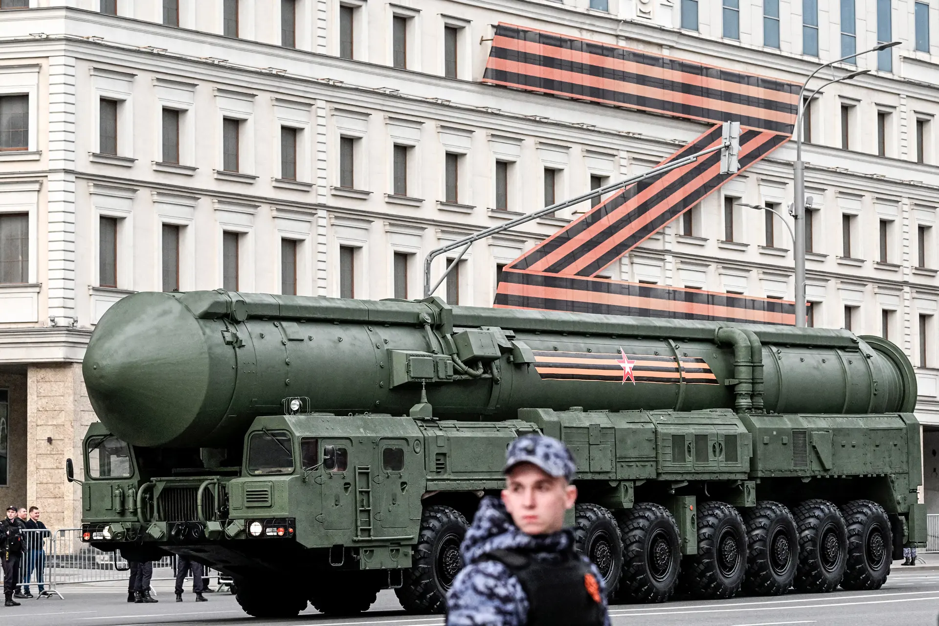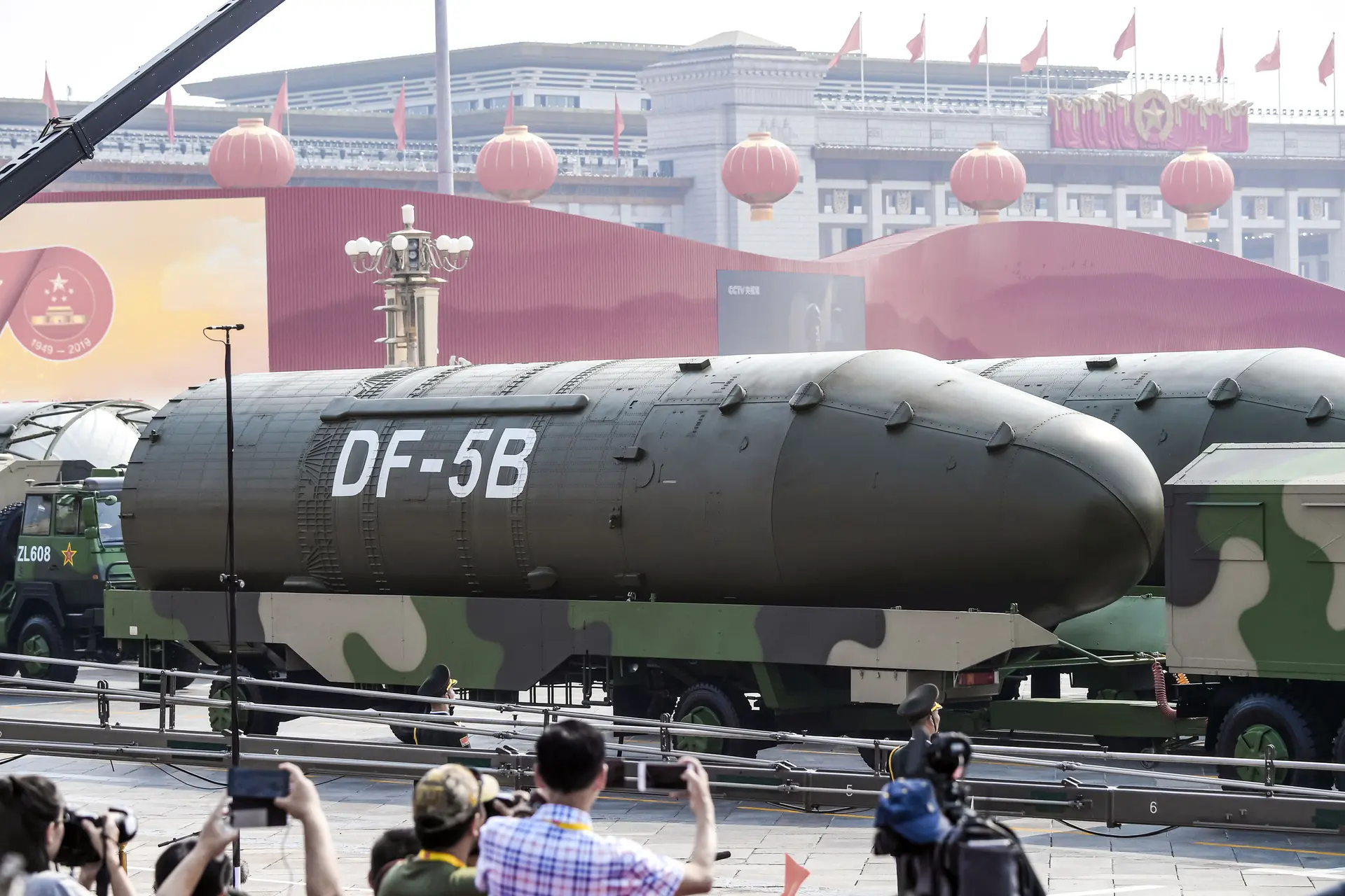 (Πάνω) Ένας ρωσικός εκτοξευτής διηπειρωτικών βαλλιστικών πυραύλων Yars κινείται κατά μήκος του δρόμου Garden Ring μπροστά από ένα τεράστιο γράμμα Z, τακτικό διακριτικό των ρωσικών στρατευμάτων στην Ουκρανία, προς την Κόκκινη Πλατεία για μια πρόβα παρέλασης στο κέντρο της Μόσχας στις 4 Μαΐου 2023. (Κάτω) Στρατιωτικά οχήματα που μεταφέρουν διηπειρωτικούς βαλλιστικούς πυραύλους DF-5B συμμετέχουν σε στρατιωτική παρέλαση στην πλατεία Τιενανμέν στο Πεκίνο την 1η Οκτωβρίου 2019. (Kirill Kudryavtsev/AFP μέσω Getty Images, Greg Baker/AFP μέσω Getty Images).
