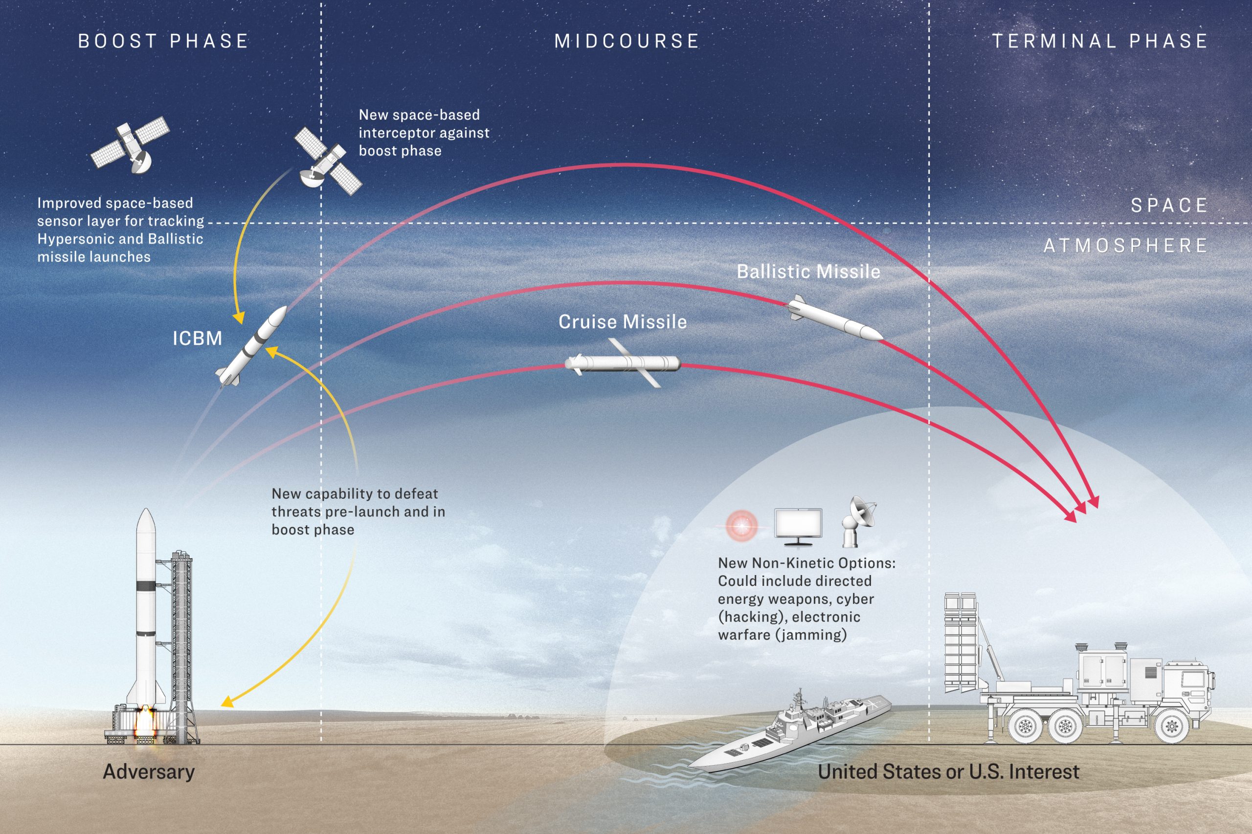 Το εκτελεστικό διάταγμα έδωσε στο υπουργείο Άμυνας 60 ημέρες για να αξιολογήσει το δίκτυο αντιπυραυλικής άμυνας των ΗΠΑ και να το αναβαθμίσει με αισθητήρες υπερηχητικών όπλων, διαστημικούς αναχαιτιστές πυραύλων και άλλες αποκαλούμενες «μη κινητικές» δυνατότητες αντιπυραυλικής άμυνας.
