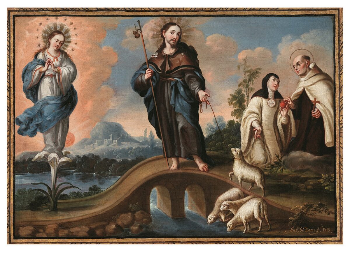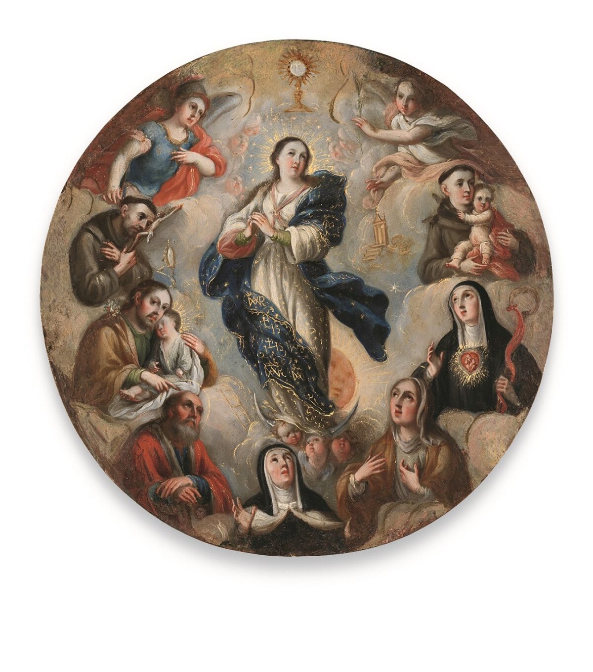 Ω, ουρανοί! Σε έναν κυκλικό πίνακα του Μεξικανού καλλιτέχνη Αντόνιο ντε Τόρες (Antonio de Torres) του 18ου αιώνα, μια ένδοξη Παναγία αιωρείται στον ουρανό μέσα σε μια δίνη από παστέλ σύννεφα. Το κεφάλι της περιβάλλεται από ένα φωτοστέφανο από 12 αστέρια και στέκεται πάνω σε μια ημισέληνο, με έναν χαρούμενο ήλιο να ξεπροβάλλει πίσω της – όλα στοιχεία που παραπέμπουν στην Αποκάλυψη 12:1 της Βίβλου. Την περιβάλλουν άγιοι, μερικοί από τους οποίους την ατενίζουν με λατρεία, ενώ άλλοι κοιτάζουν εμάς, έξω από τον πίνακα, για να ενθαρρύνουν την πίστη μας.