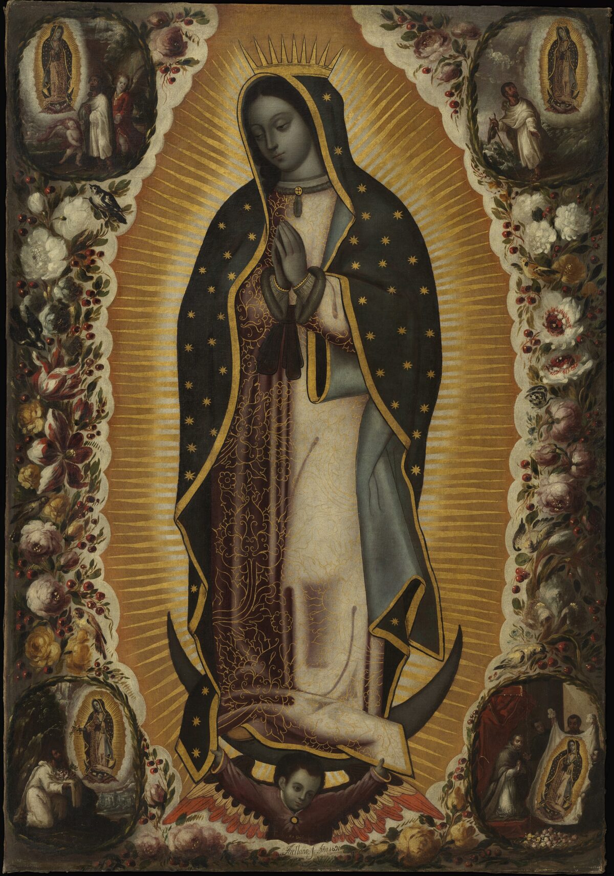 Σε παλιότερη έκθεση του LACMA, ο πίνακας «Η Παναγία της Γουαδελούπης» των Μανουέλ ντε Αρεγιάνο και Αντόνιο ντε Αρεγιάνο (Manuel de Arellano, Antonio de Arellano), του 1691, φέρει την υπογραφή «απευθείας από το πρωτότυπο» για να αναγνωριστεί το αρχικό αντίγραφο. Στον πίνακα, τέσσερις βινιέτες δείχνουν πώς η Παναγία εμφανίστηκε στον Ινδιάνο Χουάν Ντιέγκο το 1531 λέγοντάς του να ζητήσει από τον επίσκοπο να χτίσει μια εκκλησία στον λόφο προς τιμήν της. Ο θρύλος λέει ότι ο επίσκοπος δεν πίστεψε τον Ινδιάνο. Η Παναγία εμφανίστηκε στον Ντιέγκο τρεις φορές με το ίδιο αίτημα, αλλά ο επίσκοπος δεν πειθόταν. Στην τέταρτη επίσκεψή της, η Παναγία είπε στον Ντιέγκο να πάει στο λόφο, να μαζέψει τριαντάφυλλα Καστίλλης και να τα δώσει στον επίσκοπο. Ο Ντιέγκο μάζεψε τα τριαντάφυλλα στον μανδύα του και στη συνέχεια τα πήγε στον σοκαρισμένο επίσκοπο – τα τριαντάφυλλα Καστίλλης δεν φυτρώνουν στην περιοχή. Όταν ο Ντιέγκο άδειασε όλα τα τριαντάφυλλα από τον μανδύα του, ως εκ θαύματος αποτυπώθηκε στον μανδύα η εικόνα της Παναγίας. Η τελευταία βινιέτα του πίνακα δείχνει το θαύμα.