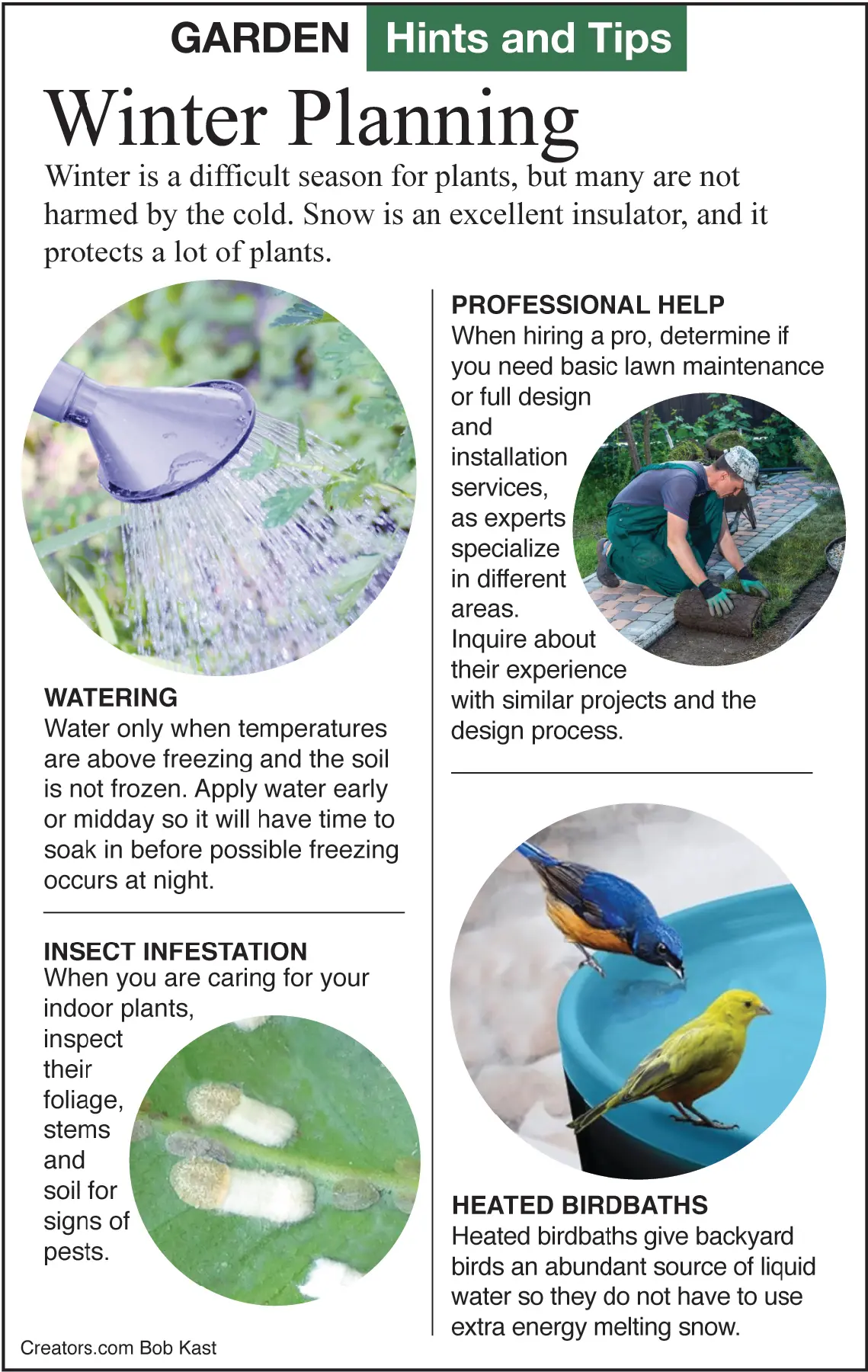 Κατά τη διάρκεια της καλλιεργητικής περιόδου, τα πουλιά τρώνε πολλά έντομα-εχθρούς των φυτών σας. Ανταποδώστε τους τη χάρη κατά τη διάρκεια του χειμώνα, τοποθετώντας μια ταΐστρα πουλιών και ένα θερμαντήρα για το λουτρό τους. Το λίπος και οι μαύροι ηλιόσποροι παρέχουν τις περισσότερες θερμίδες, ώστε τα πουλιά να έχουν αρκετή ενέργεια και να παραμείνουν ζεστά. Το νερό και το καταφύγιο είναι επίσης απαραίτητα, οπότε μην τα ξεχάσετε όταν σχεδιάζετε τον κήπο σας. Ο θερμαντήρας για το λουτρό πουλιών έχει σχεδιαστεί για να μην παγώνει το νερό, ώστε να διατηρείται πόσιμο. Δεν μετατρέπει το λουτρό των πουλιών σε σπα και δεν καταναλώνει πολύ ηλεκτρικό ρεύμα.