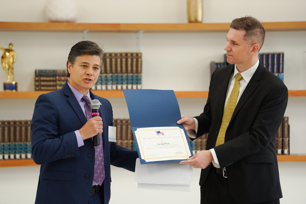 Ο Λέστερ Τσανγκ (Ρ-Μπρούκλιν), ο πρώτος Ασιάτης Αμερικάνος που εκπροσωπεί το Μπρούκλιν στην Πολιτειακή Συνέλευση της Νέας Υόρκης, παρευρέθηκε επίσης στην εκδήλωση, αφού το προηγούμενο βράδυ το πολιτειακό νομοθετικό σώμα ολοκλήρωσε τις συνεδριάσεις του για το 2023. Είπε ότι το Gan Jing World πήρε μια σοφή απόφαση επιλέγοντας την τοποθεσία της επιχείρησης και ότι θα προσφέρει στους νέους ανθρώπους θέσεις εργασίας στα βόρεια της πολιτείας της Νέας Υόρκης.
