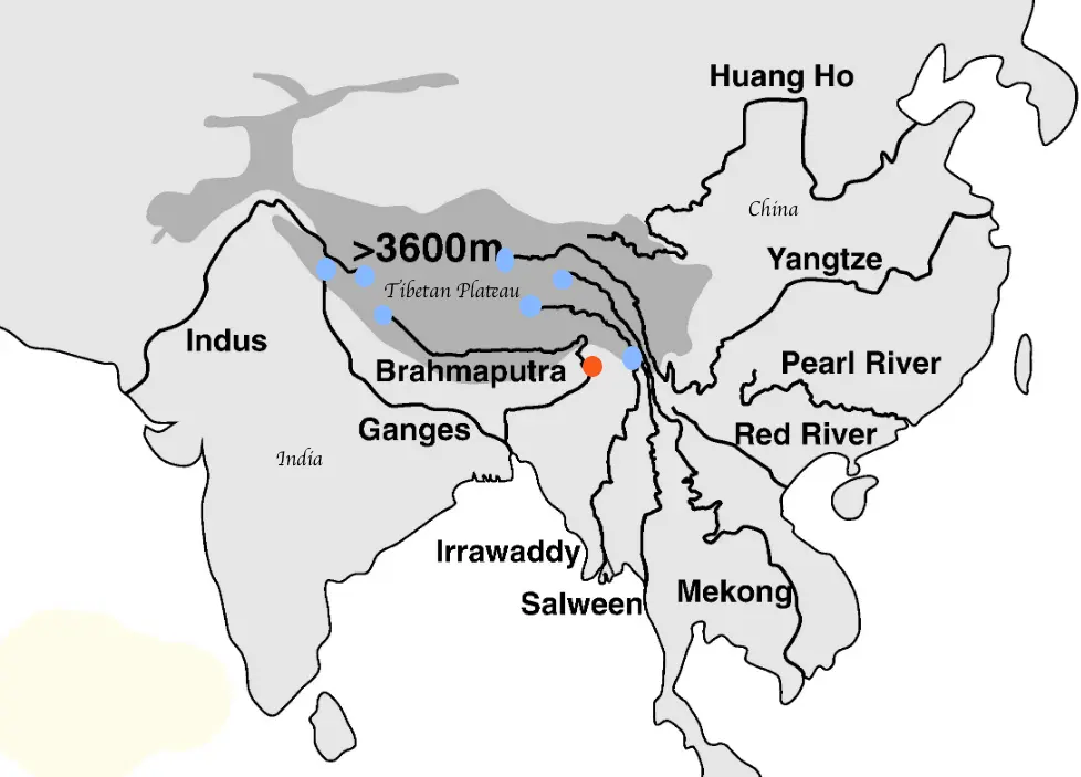 Ο ποταμός Βραχμαπούτρα, που ξεκινά από το Θιβέτ και διαρρέει την Ινδία και το Μπανγκλαντές, διαθέτει τεράστιες ενεργειακές δυνατότητες, ιδιαίτερα στην πολιτεία Αρουνάτσαλ Πραντές, κοντά στα ινδοκινεζικά σύνορα. Το ανάντη τμήμα του είναι γνωστό ως ποταμός Γιαρλούνγκ Τσανγκμπό.