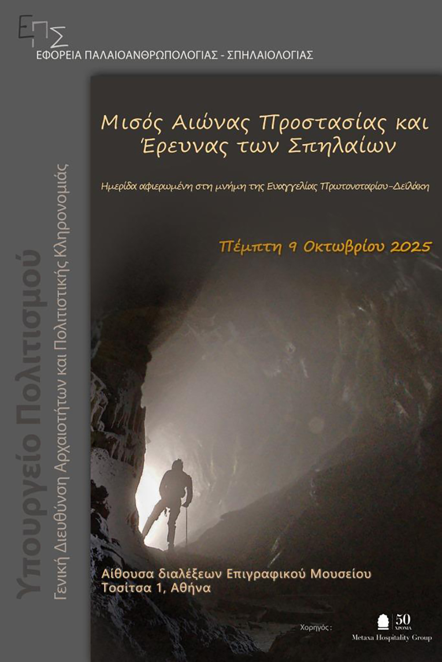 Η Εφορεία Παλαιοανθρωπολογίας–Σπηλαιολογίας διοργανώνει επιστημονική ημερίδα με τίτλο «Μισός αιώνας προστασίας και έρευνας των σπηλαίων» την Πέμπτη 9 Οκτωβρίου 2025, η οποία θα διεξαχθεί στην αίθουσα διαλέξεων του Επιγραφικού Μουσείου. Στη διοργάνωση συμμετέχουν το υπουργείο Πολιτισμού και η Γενική Διεύθυνση Αρχαιοτήτων και Πολιτιστικής Κληρονομιάς.