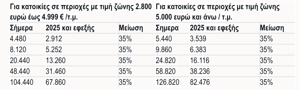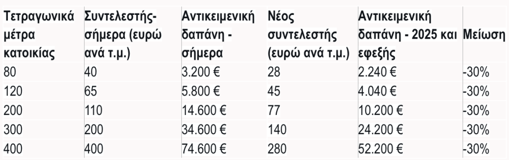 • Κατά 30% για κατοικίες σε περιοχές με Τιμή Ζώνης κάτω από 2.800 ευρώ ανά τετραγωνικό. Για σπίτια έως 80 τ.μ., ο συντελεστής μειώνεται από 40 σε 28 ευρώ ανά τ.μ. και η αντίστοιχη μείωση της αντικειμενικής δαπάνης από 3.200 ευρώ σε 2.240 ευρώ (-30%). Ενώ για κατοικίες 120 τ.μ., η αντικειμενική δαπάνη μειώνεται από 5.800 σε 4.040 ευρώ.