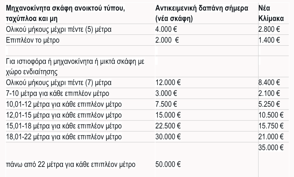 Για τα σκάφη, σήμερα, η τεκμαρτή δαπάνη από κάθε σκάφος μειώνεται ανάλογα με την παλαιότητά του κατά 15% αν έχουν παρέλθει πάνω από 5 έτη από το έτος που νηολογήθηκε για πρώτη φορά, ή και 30% αν έχουν παρέλθει 10 έτη. Με το νέο καθεστώς, μειώνεται κατά 30% η τεκμαρτή δαπάνη και για τα νεότερα σκάφη, καθώς οι δαπάνες συντήρησης δεν είναι υψηλότερες στα νεότερα.