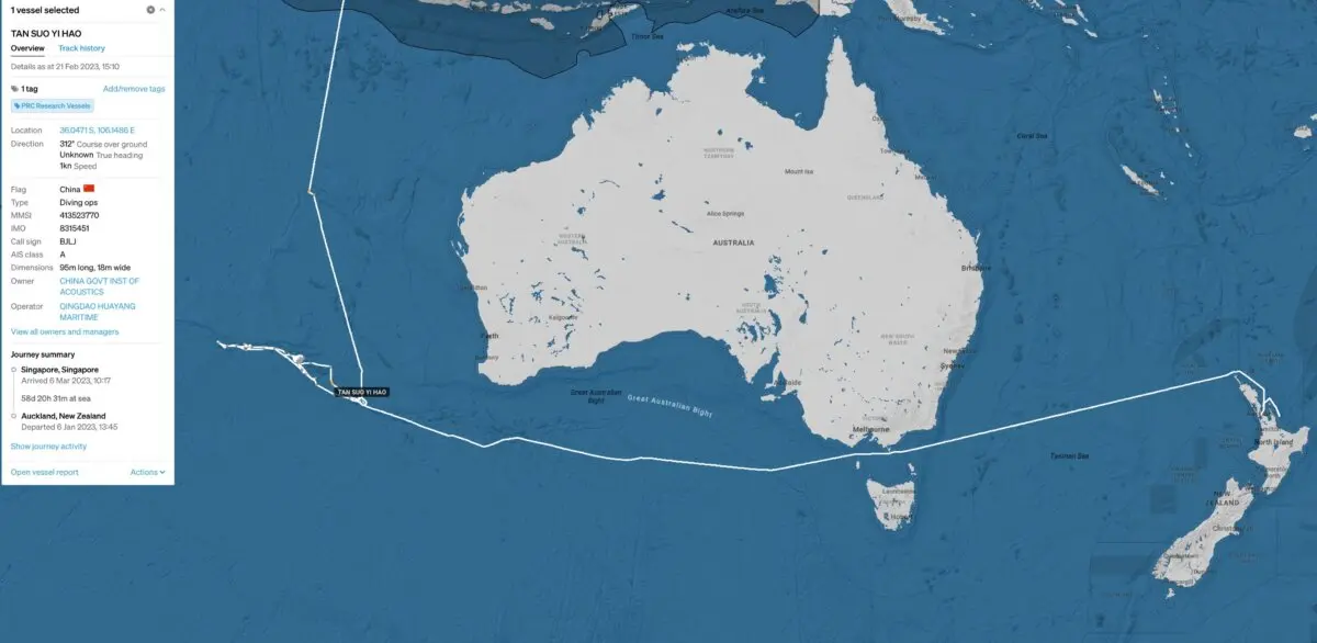 Αφήνοντας τα ύδατα της Νέας Ζηλανδίας, το Tan Suo Yi Hao κατέπλευσε προς την Αυστραλία, αιφνιδιάζοντας την κυβέρνηση. Ο πρωθυπουργός Άντονυ Αλμπανέζε σχολίασε στον Τύπο ότι θα προτιμούσε να μην είχε πράξει έτσι το πλοίο, ενώ το υπουργείο Άμυνας της Αυστραλίας όρισε την παρακολούθηση του σκάφους από αέρος. Το Tan Suo Yi Hao πέρασε νοτίως της Αυστραλίας, προχωρώντας σταθερά, και σταματώντας για κάποιο χρονικό διάστημα περίπου 400 ναυτικά μίλια (741 χλμ.) νοτιοανατολικά του Περθ (νοτιοδυτική Αυστραλία), όπου κατασκευαζόταν βάση υποβρυχίων του στόλου του AUKUS για το νότιο ημισφαίριο.
