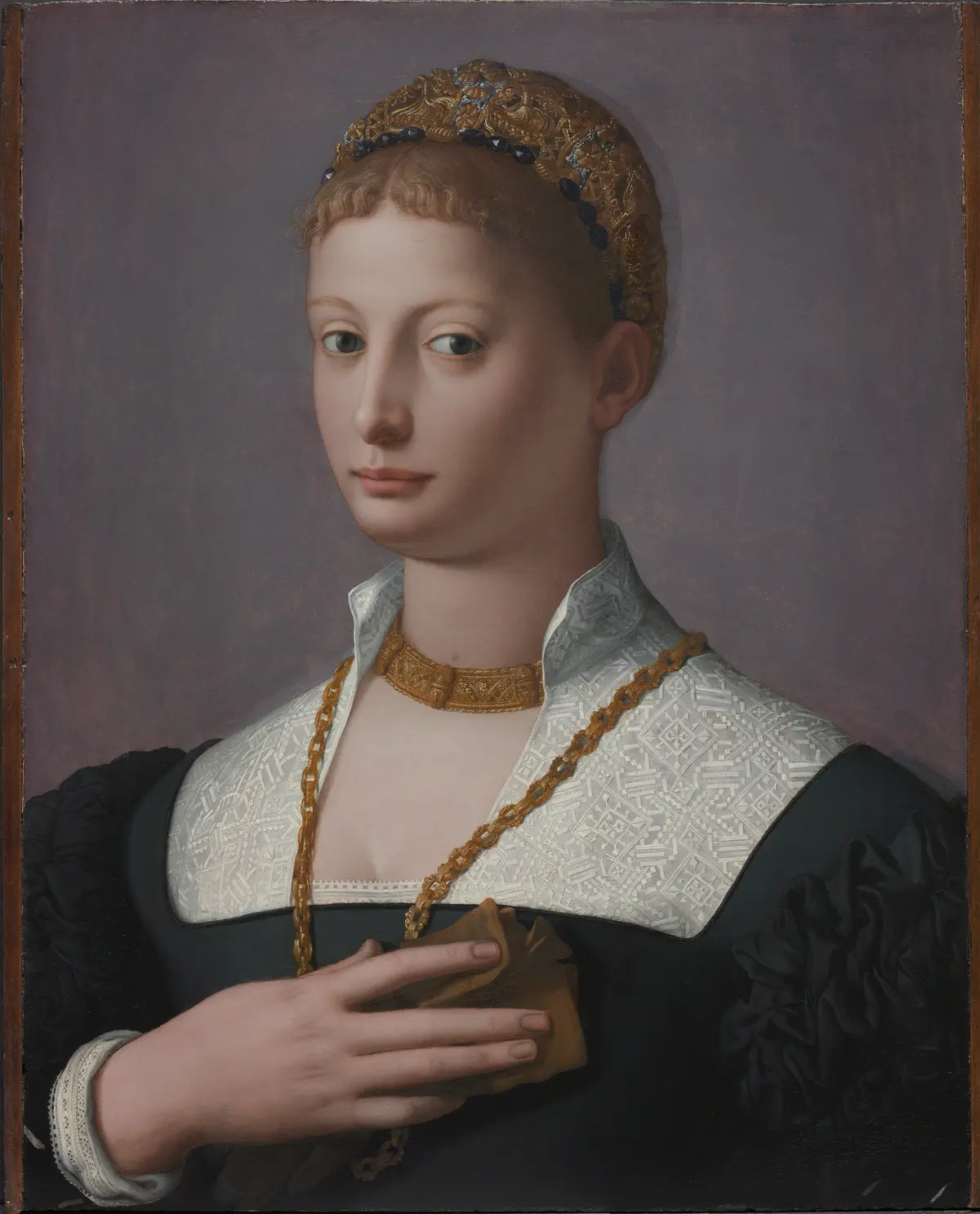 Η χρήση ενός απλού φόντου από τον Μπροντζίνο αναδεικνύει τα εκλεπτυσμένα ρούχα του μοντέλου του, τα οποία δείχνουν την κομψότητα, τον πλούτο και την κοινωνική της θέση. Η γυναίκα φοράει ένα λινό, λεπτοκεντημένο γιακά. Μέρος του υφάσματος είναι διακοσμημένο με δαντέλα, όπως και οι μανσέτες της. Στη συλλογή που παρουσίασε το φθινόπωρο του 2015, η Φερρέττι αναφέρθηκε ρητά στην ιταλική αναγεννησιακή μόδα. Το Μουσείο του Κλήβελαντ σημειώνει: «Η δαντέλα που τονίζεται γύρω από τη μπλούζα αυτού του συνόλου παραπέμπει στην εξέλιξη των δαντελένιων γιακάδων, ιδιαίτερα στη γυναικεία μόδα, από τα partlets στα ruffs, κατά τη διάρκεια του 16ου αιώνα».