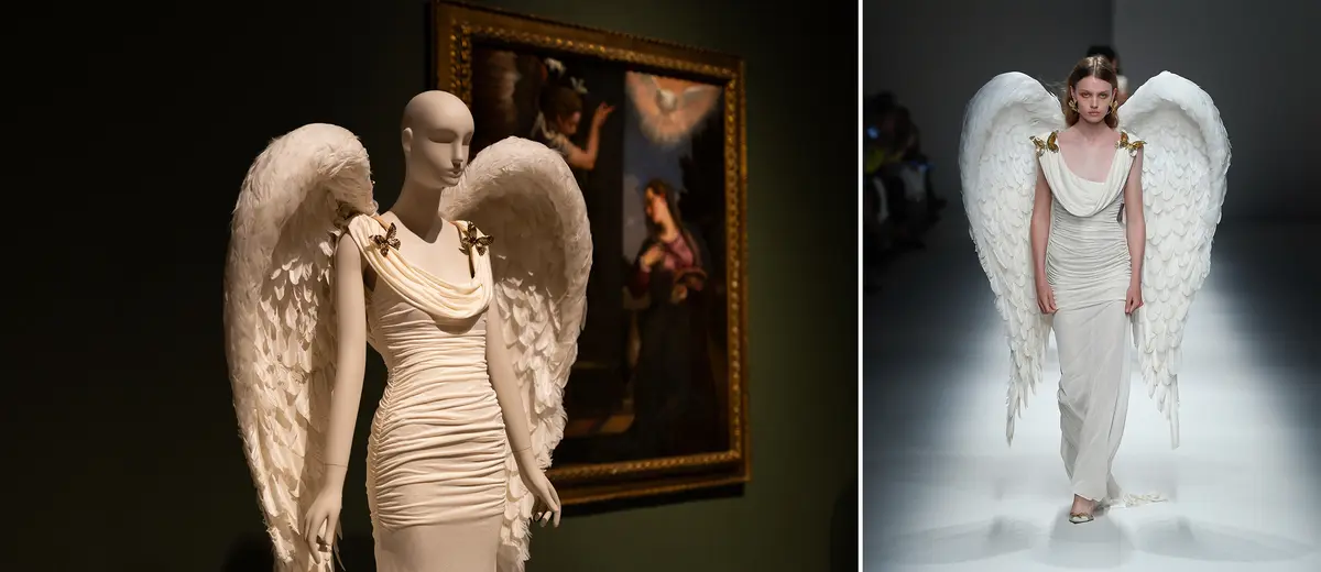 Το λευκό βραδινό φόρεμα του Νικόλα Μπρονιάνο, φορεμένο με φτερά, από την Εαρινή συλλογή του 2024, παραπέμπει ευθέως στα φτερά των αγγέλων όπως αποτυπώνονται στη δυτική χριστιανική τέχνη. Στον «Ευαγγελισμό» του Βερονέζε (περ. 1580) ο Αρχάγγελος Γαβριήλ ανακοινώνει στην Παναγία ότι θα γεννήσει τον γιο του Θεού, ενώ το Άγιο Πνεύμα με τη μορφή λευκού περιστεριού, διακρίνεται πάνω από το κεφάλι της.
