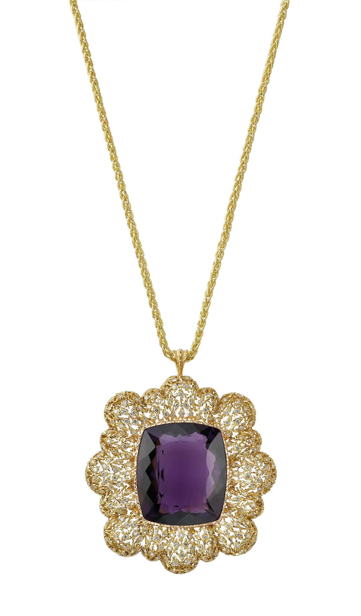 Ο πολυτελής ιταλικός οίκος κοσμημάτων Buccellati ιδρύθηκε το 1919 από τον Μάριο Μπουτσέλλατι, και οι απόγονοί του εξακολουθούν να ασχολούνται με την επιχείρηση. Η κληρονομιά του οίκου διατηρεί τις σχεδιαστικές αρχές του, οι οποίες αντλούσαν έμπνευση από το στυλ και τις τεχνικές των χρυσοχόων της Αναγέννησης. Η καρφίτσα-μενταγιόν Violante του 2007 είναι κατασκευασμένη από αμέθυστο, χρυσό σε διάφορα χρώματα και διαμάντια.
