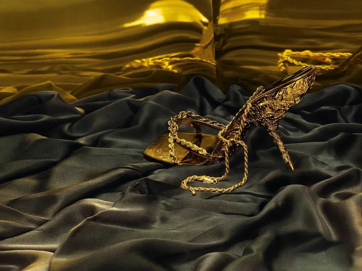 Εκτός από τα λαμπερά νήματα και τους πολύτιμους λίθους, η έκθεση φιλοξενεί και ένα χρυσό παπούτσι. Το πέδιλο-κόσμημα (Jewel Sandal) του οίκου Ferragamo παρουσιάστηκε στη Φθινοπωρινή συλλογή του 2023. Αποτελεί μια αναφορά σε ένα παλαιότερο σανδάλι που είχε δημιουργήσει ο ιδρυτής της εταιρείας, Σαλβατόρε Φερράγκαμο, για έναν Αμερικανό πελάτη το 1956. Του είχε ανατεθεί να δημιουργήσει ένα σανδάλι από 18 καράτια χρυσό. Το σχέδιό του περιελάμβανε ένα λουλούδι που έμοιαζε με αμπέλι χαραγμένο στη φτέρνα και στους ιμάντες, που θύμιζε διακοσμητικά θέματα της αναγεννησιακής τέχνης. Ήταν γοητευμένος από την ιταλική αναγεννησιακή τέχνη και συχνά αντλούσε έμπνευση από εκείνη την περίοδο.