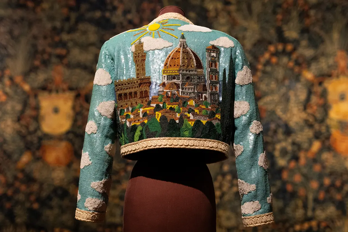Στην έκθεση παρουσιάζονται περίπου 80 σύνολα και ενδύματα και 40 κοσμήματα από τον 20ό και 21ο αιώνα, παράλληλα με έργα τέχνης της ιταλικής Αναγέννησης από τη μόνιμη συλλογή του Μουσείου, που περιλαμβάνουν εικαστικά, διακοσμητικά και υφαντικά κομμάτια από το 1400 έως τις αρχές του 1600.