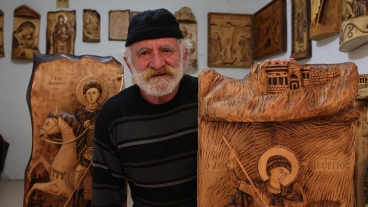 Επισκεφθήκαμε το γεμάτο από κάθε μορφής ξύλου εργαστήριό του, όπου άλλα έργα είναι μισοτελειωμένα με σκαλιστές μορφές αγίων, ζώων, πουλιών και στοιχείων της φύσης κι άλλα κρεμασμένα στους τοίχους, περιμένοντας τη σειρά τους για να πάρουν τη μορφή που θα τους δώσει ο καλλιτέχνης. Μας ξεναγεί στον χώρο του και νιώθουμε να μας κατακλύζει η σκέψη ότι αυτός ο δημιουργός διαθέτει όχι απλώς καλή τεχνική κατάρτιση, αλλά πάνω απ’ όλα υπομονή, πίστη στην εργασία που κάνει και μια σπάνια σχέση με τα φυσικά υλικά του δάσους.