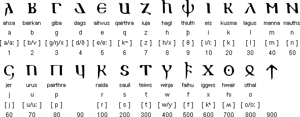 Ο παρακάτω πίνακας παρουσιάζει τα γράμματα του γοτθικού αλφαβήτου, τη φωνητική τους απόδοση, την αριθμητική αξία και τον αντίστοιχο ελληνικό χαρακτήρα. Σημειώνονται επίσης οι περιπτώσεις όπου η προέλευση είναι πιθανόν λατινική ή ρουνική.