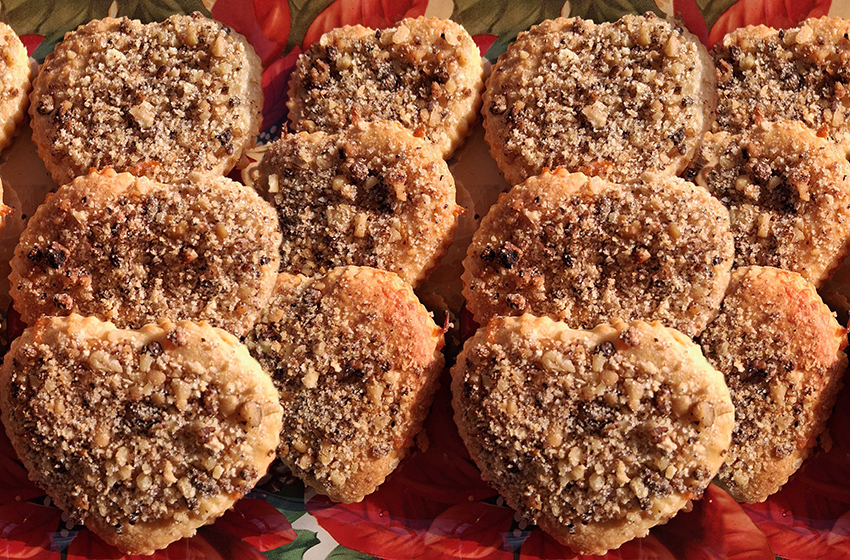 Πασπαλίζουμε τα κουλουράκια μας με το μείγμα από καρύδια, ζάχαρη και βούτυρο, τα μεταφέρουμε στο ταψί και τα ψήνουμε στους 180° C για 20 λεπτά. Μετά το ψήσιμο, άμα θέλουμε, τα πασπαλίζουμε με κανέλα.