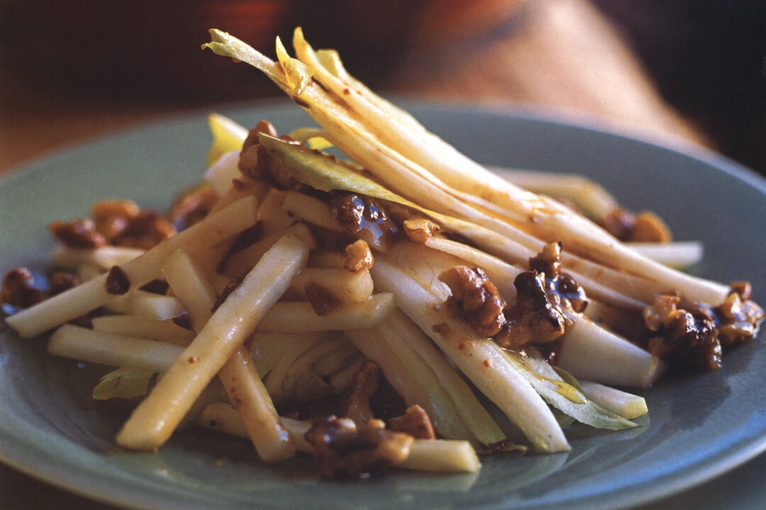Σε ένα μπολ σαλάτας ανακατέψτε τις λωρίδες αντιδιού και μήλου και πασπαλίστε με τα καρύδια.